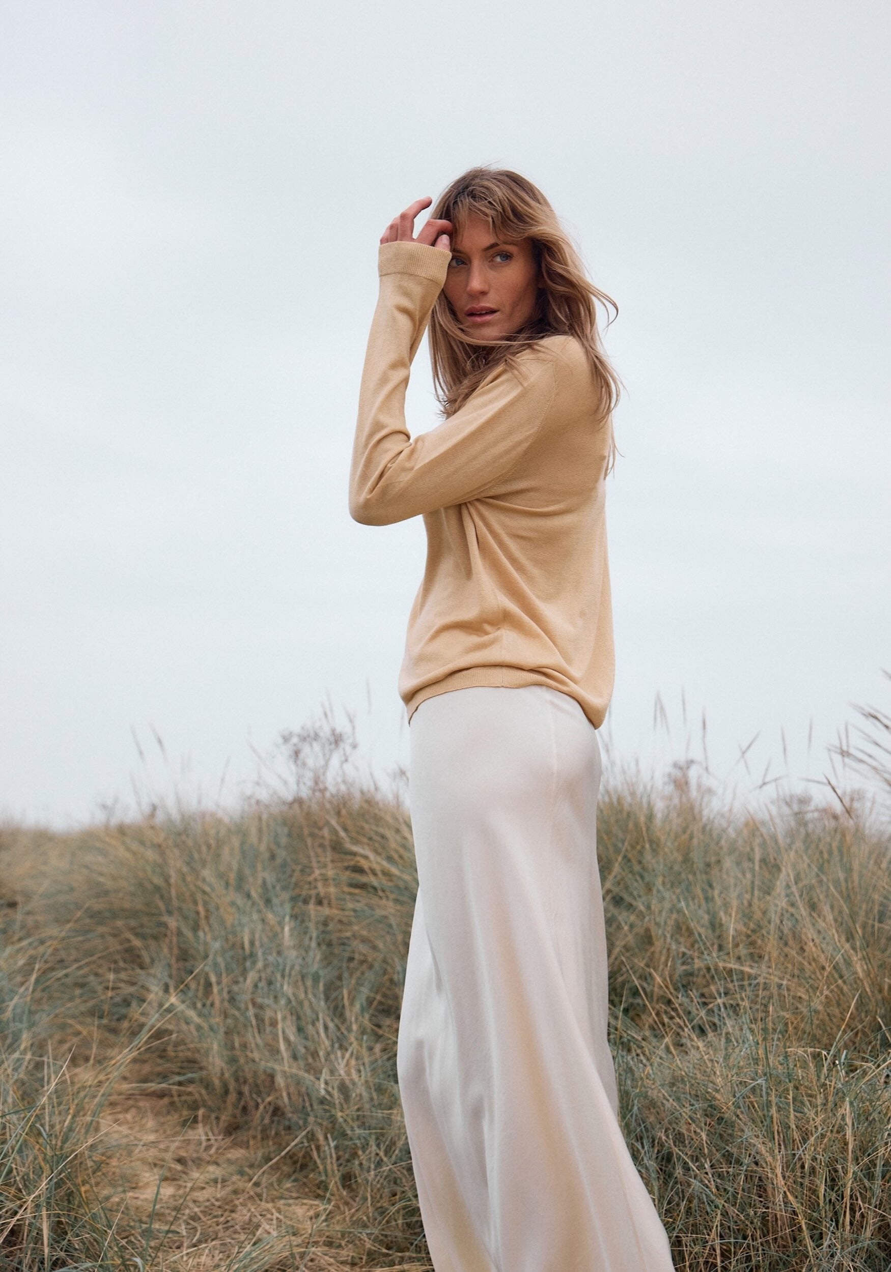 Design: Gold tee in a blend of premium cashmere and premium silk. This lightweight knit hangs loosely on the figure, ultra comfort and relaxed fit. Featherlight and extremely soft.