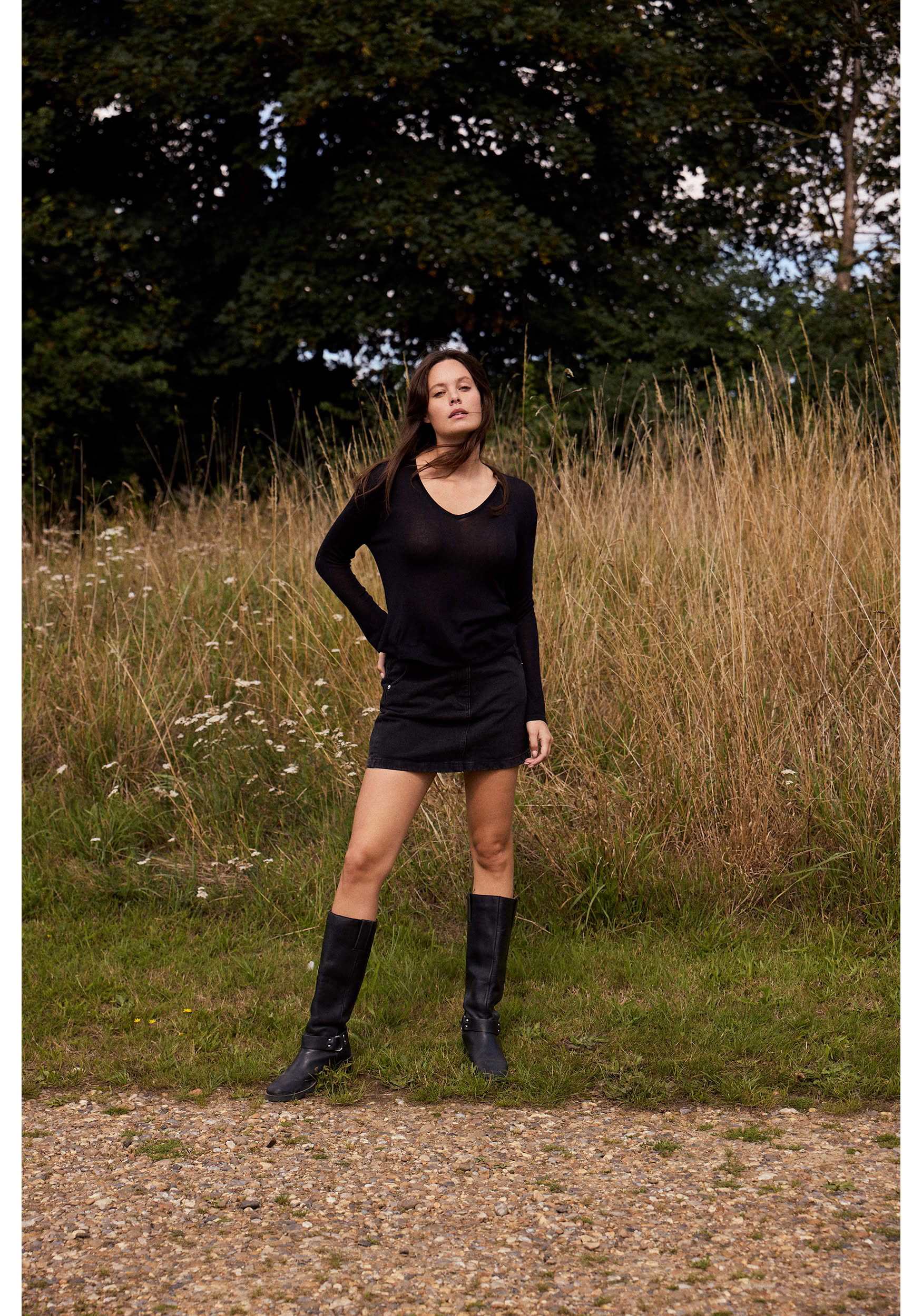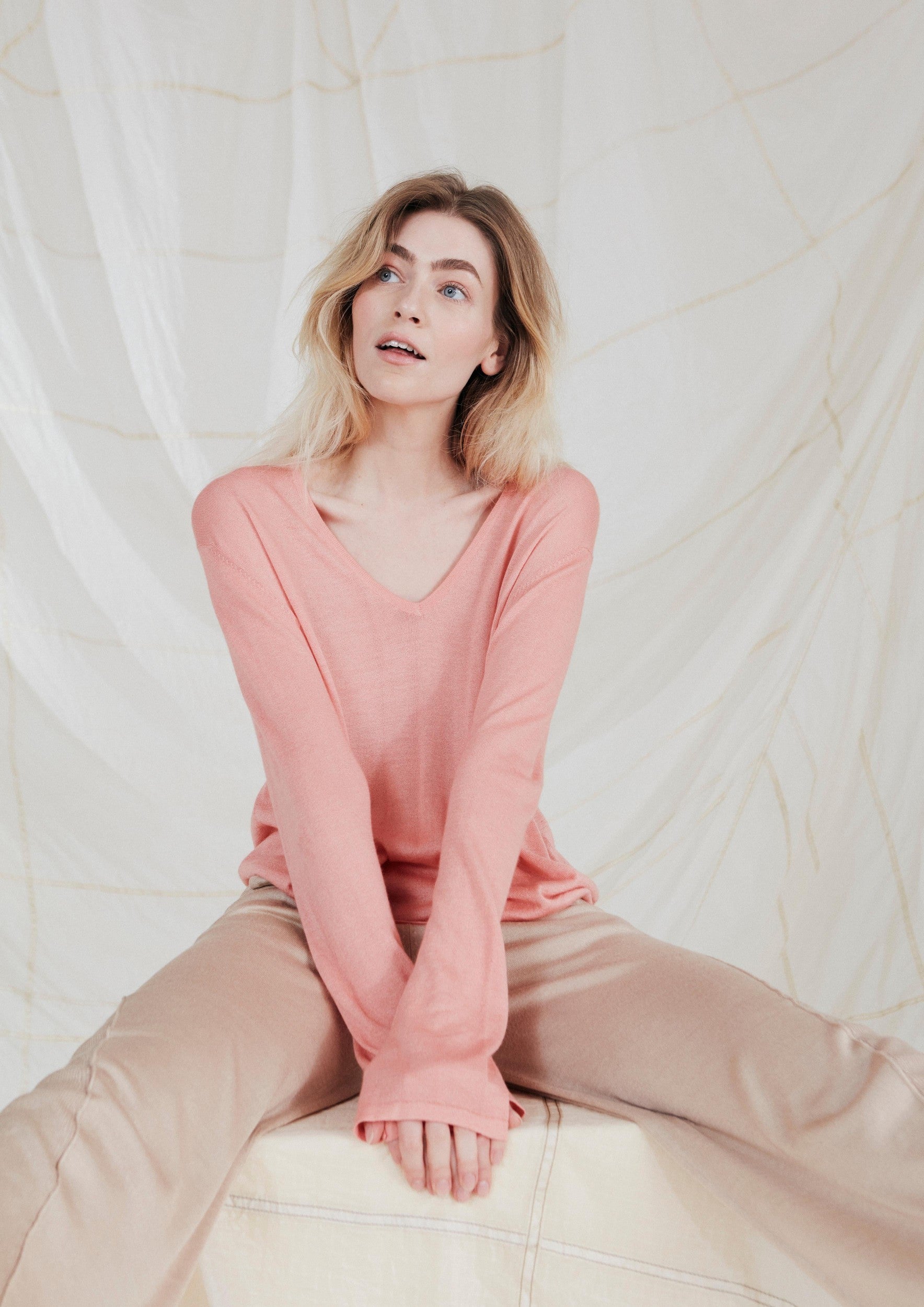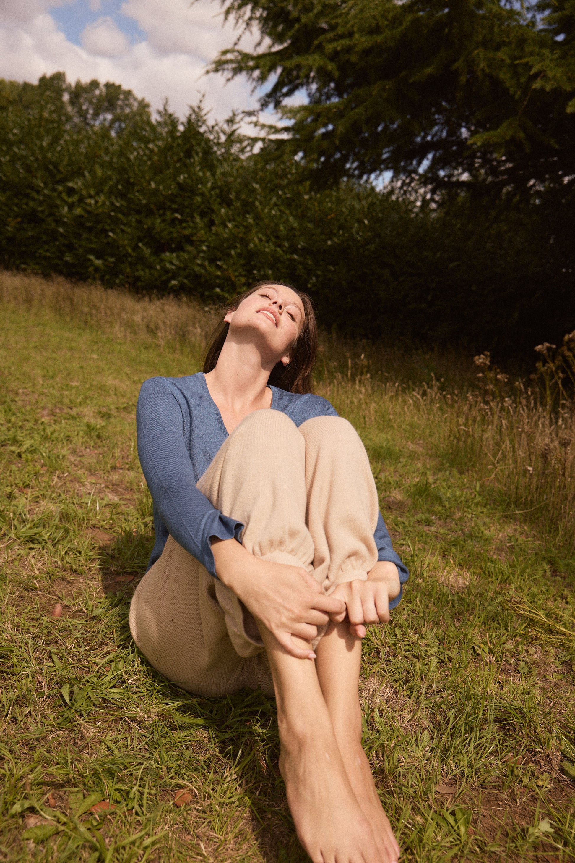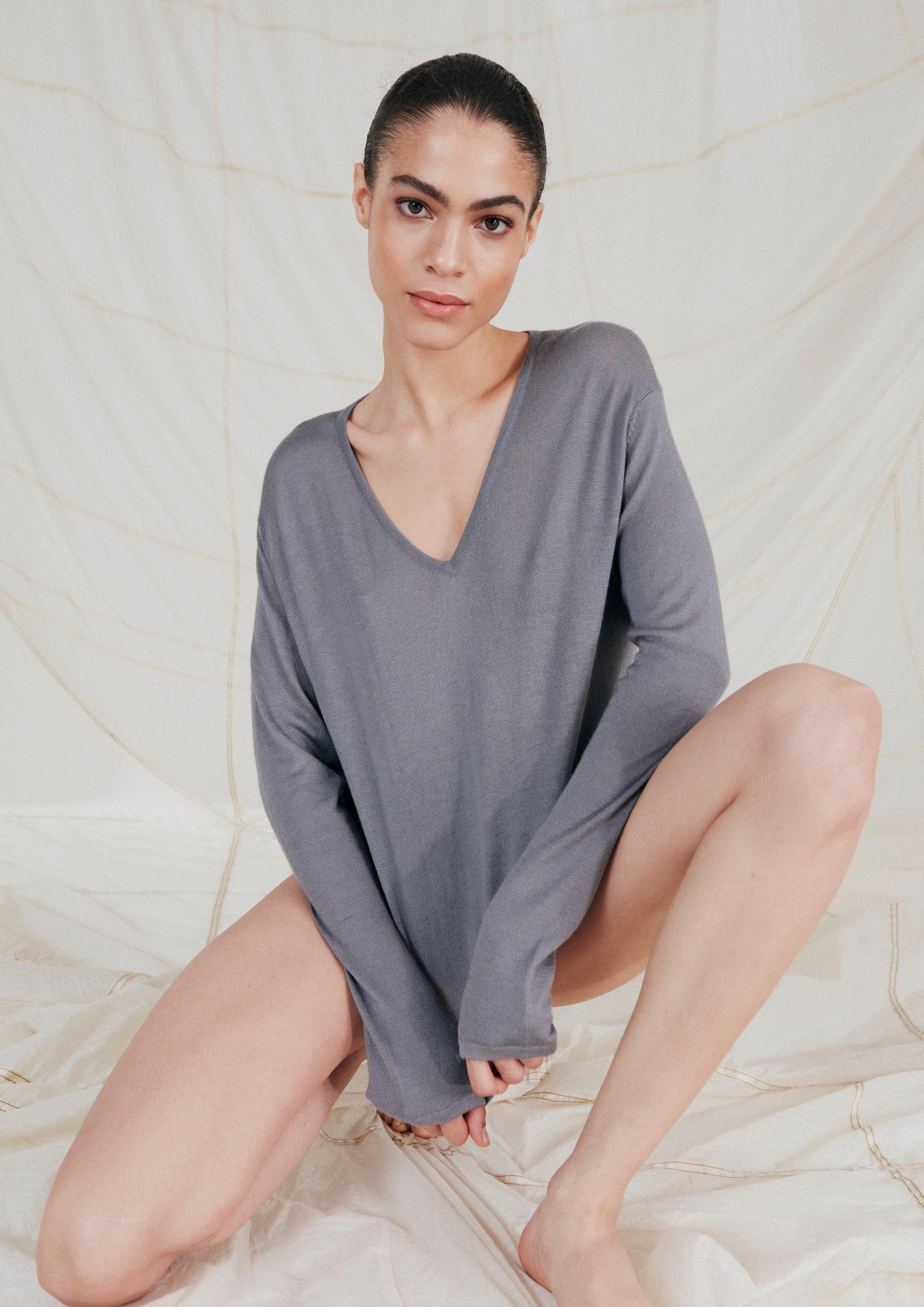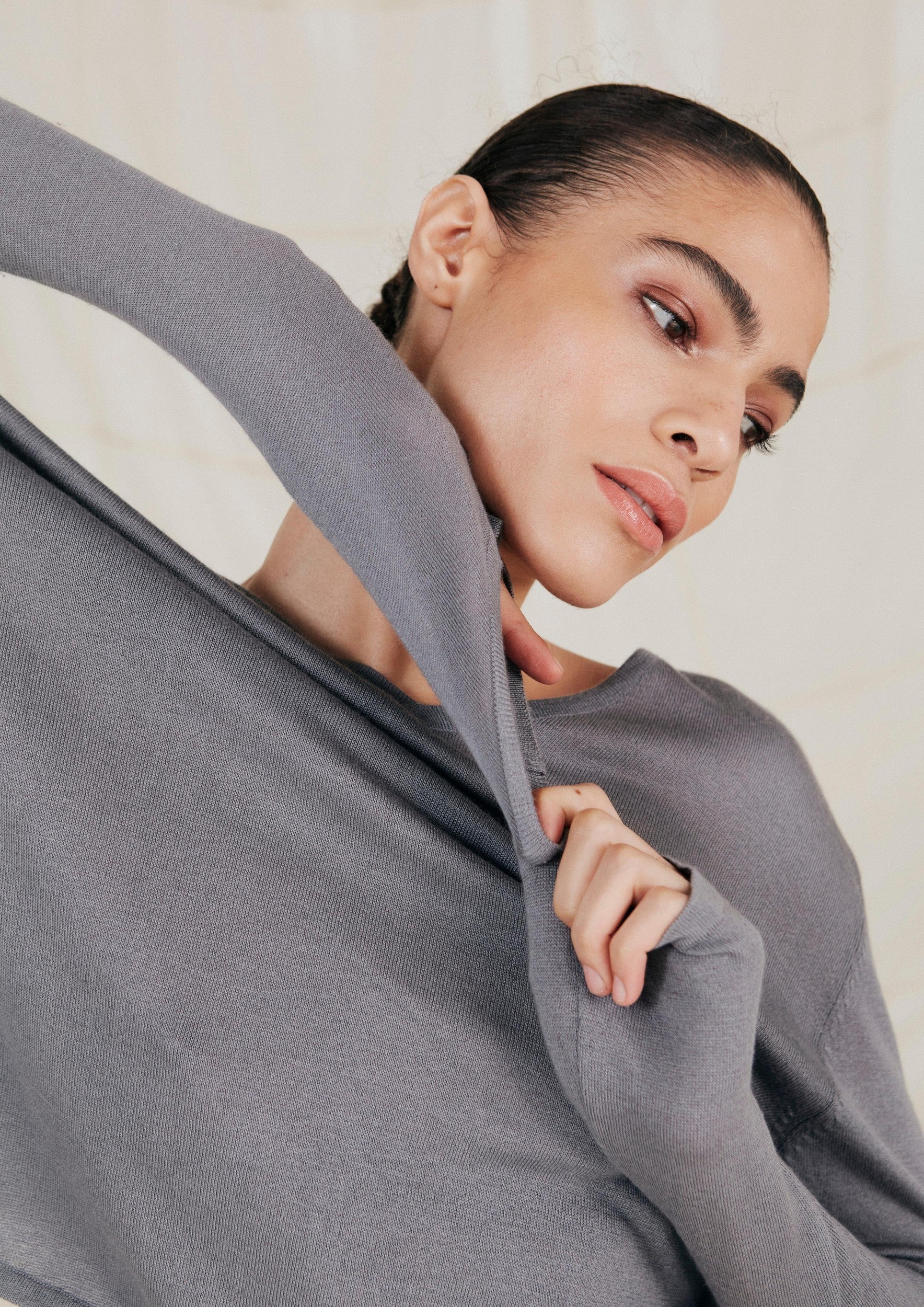 Design: Sky grey, sky blue, black or candy floss pink. Elegant long sleeve T's in a sustainable silk/cashmere blend. Slightly flared sleeve for extra glamour and a rounded edge across the hips making it slightly more swishy.