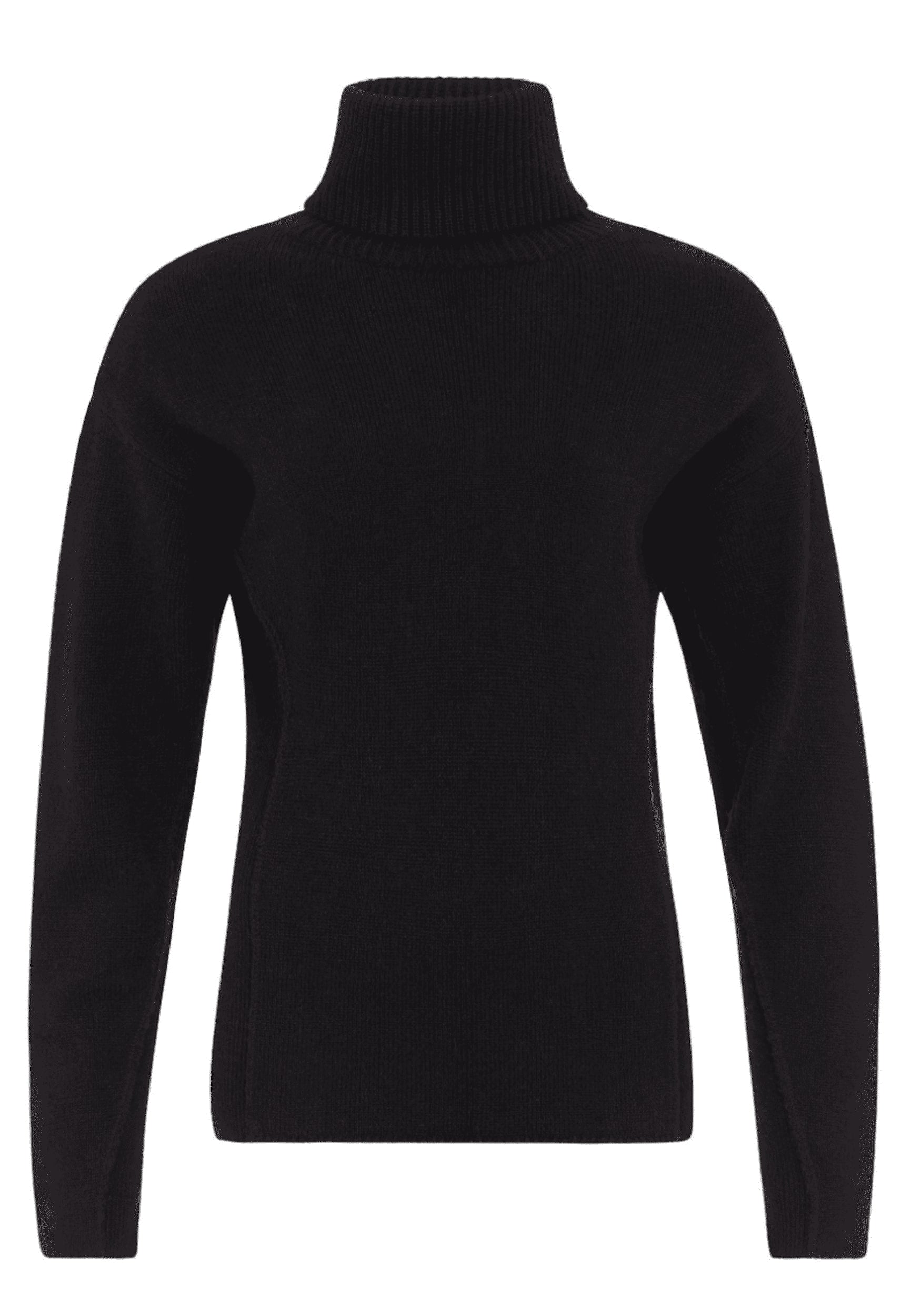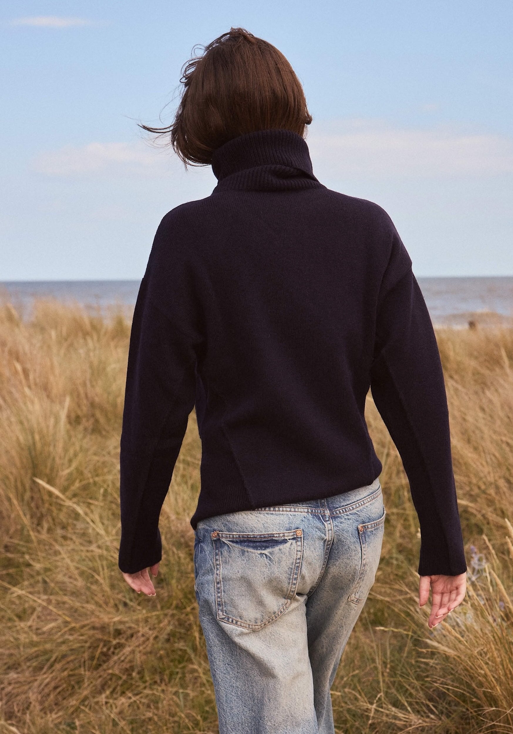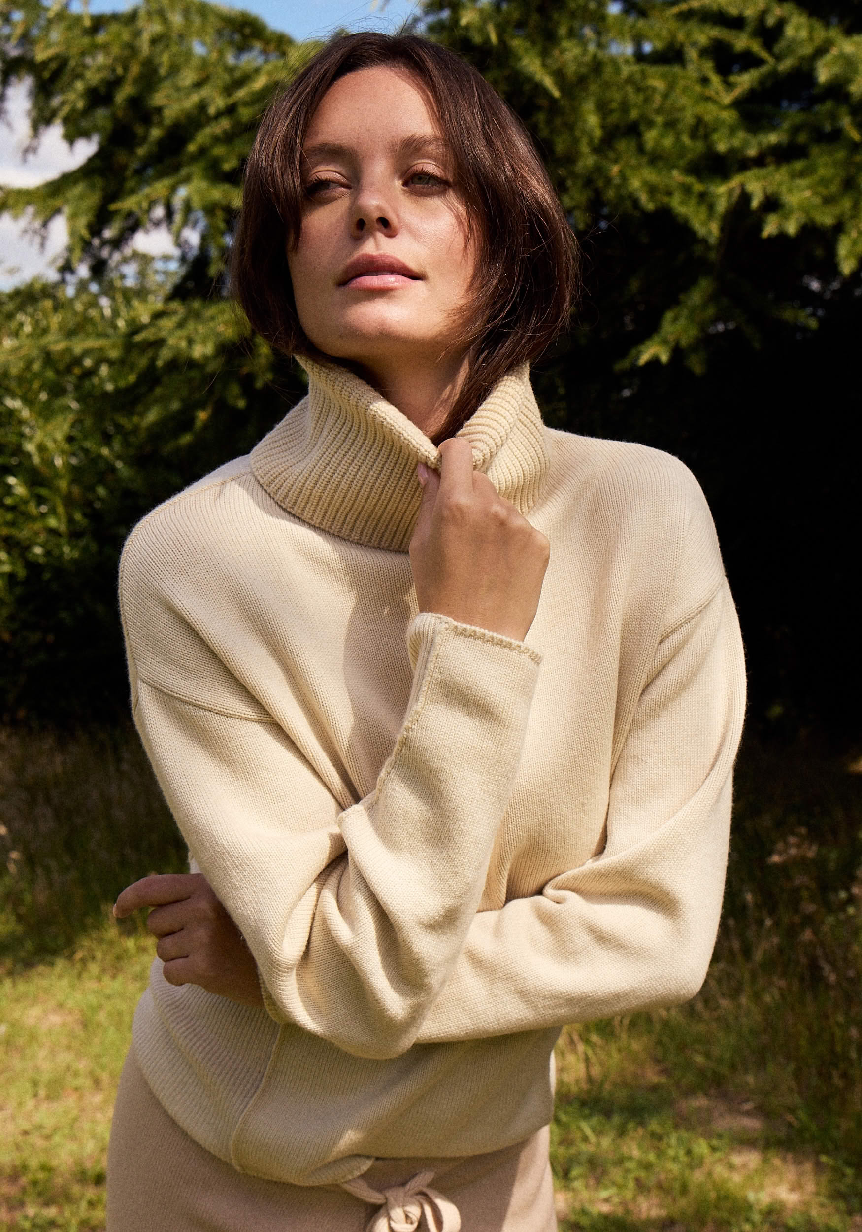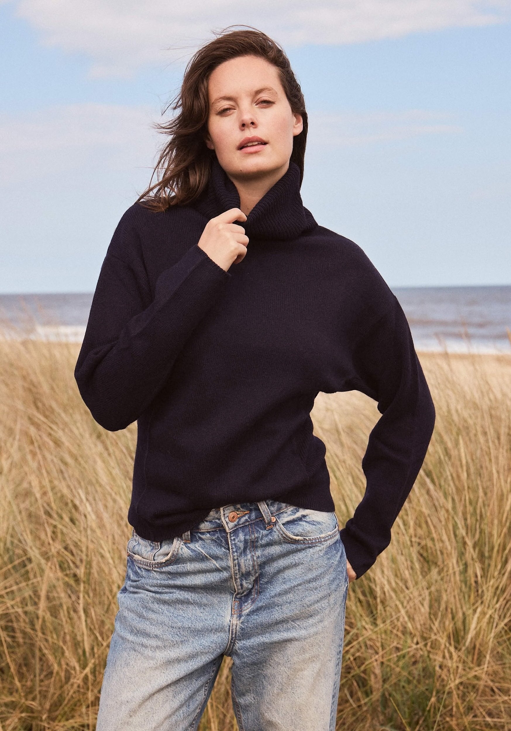 Design: Our champion jumper coming in black, soft grey, navy, chocolate, orange, oat, turquoise and butter. Made from premium sustainable cashmere blended with premium sustainable wool. High roll neck which can be doubled over, traditional Jean & Temple drop shoulder, oversized, snuggly fit. Intricate visible hemline detail on inner arms and inner body making it a uniquely fitting jumper outlining your silhouette.
