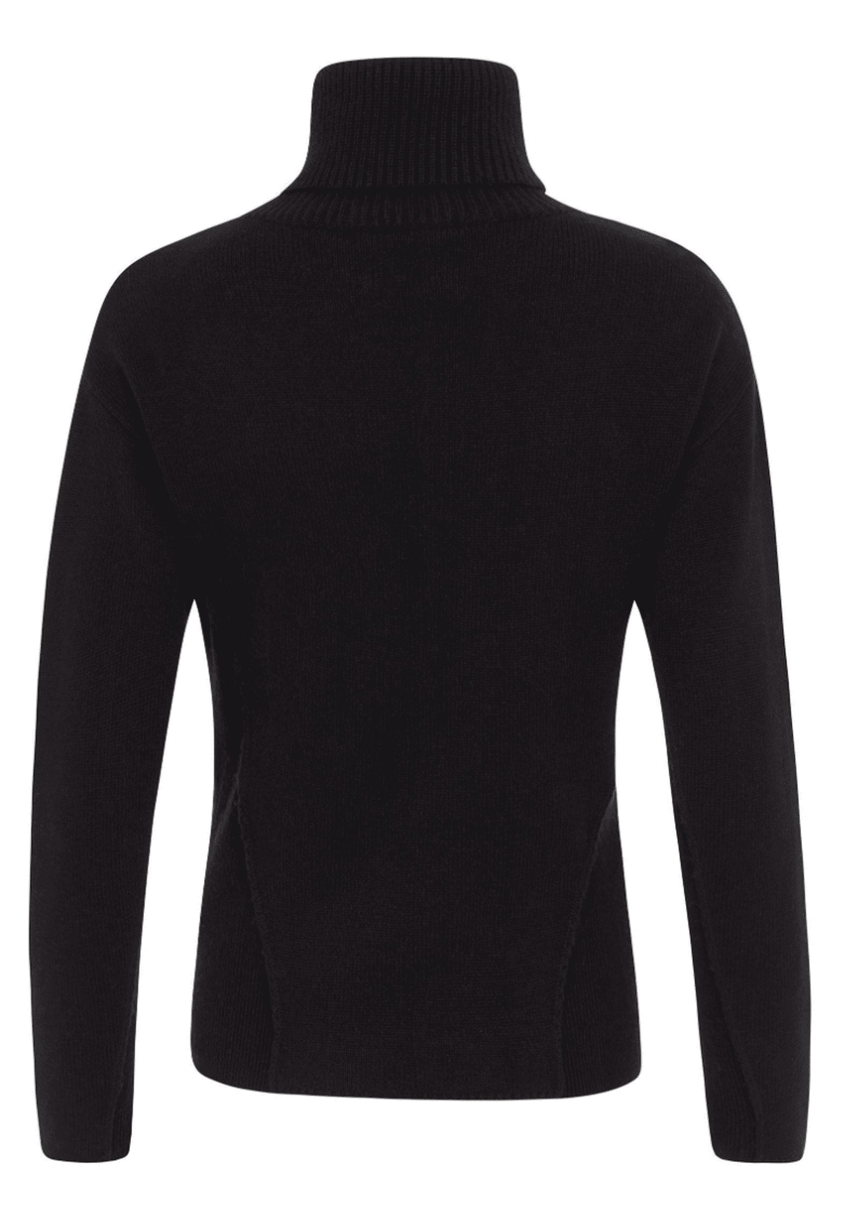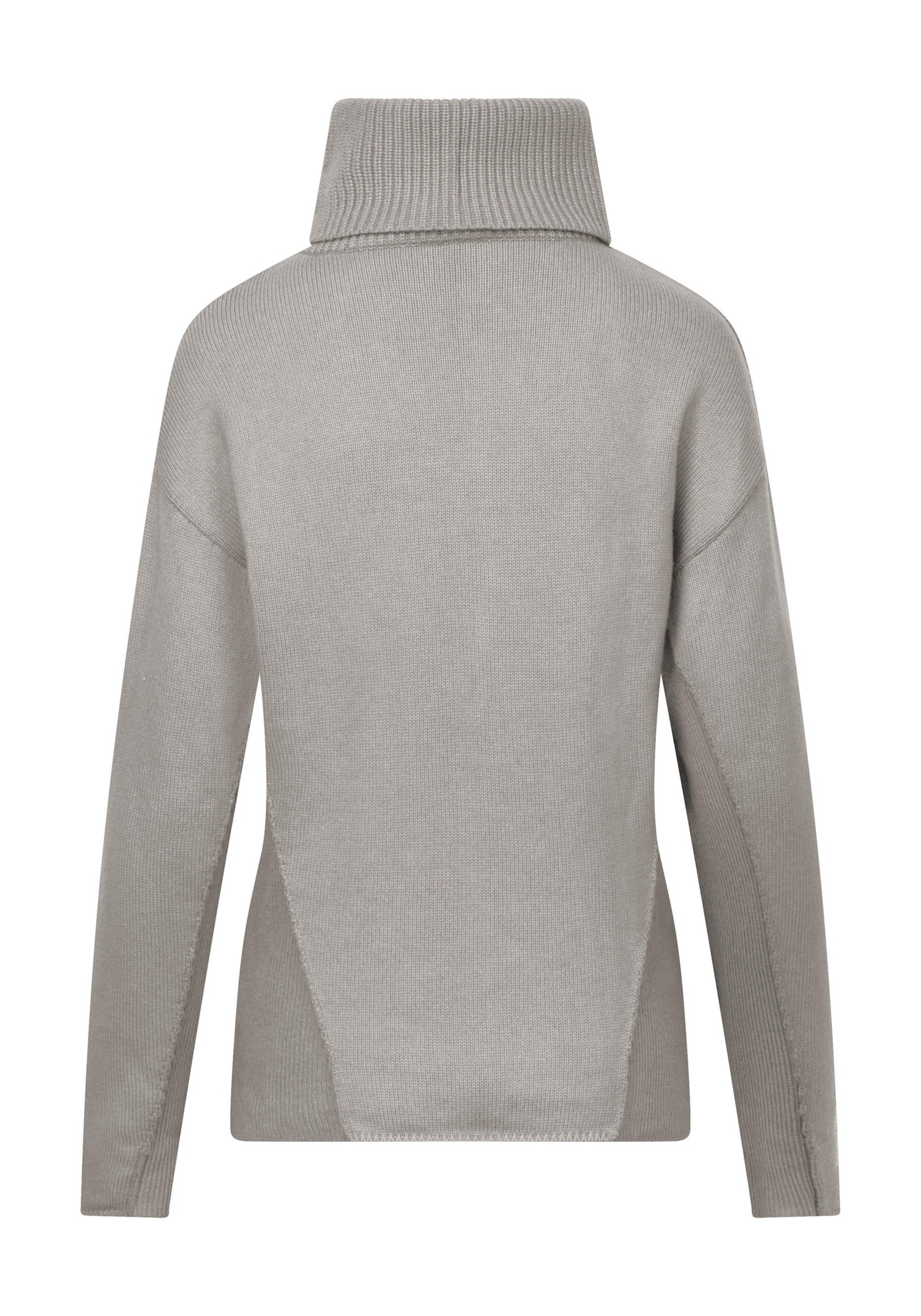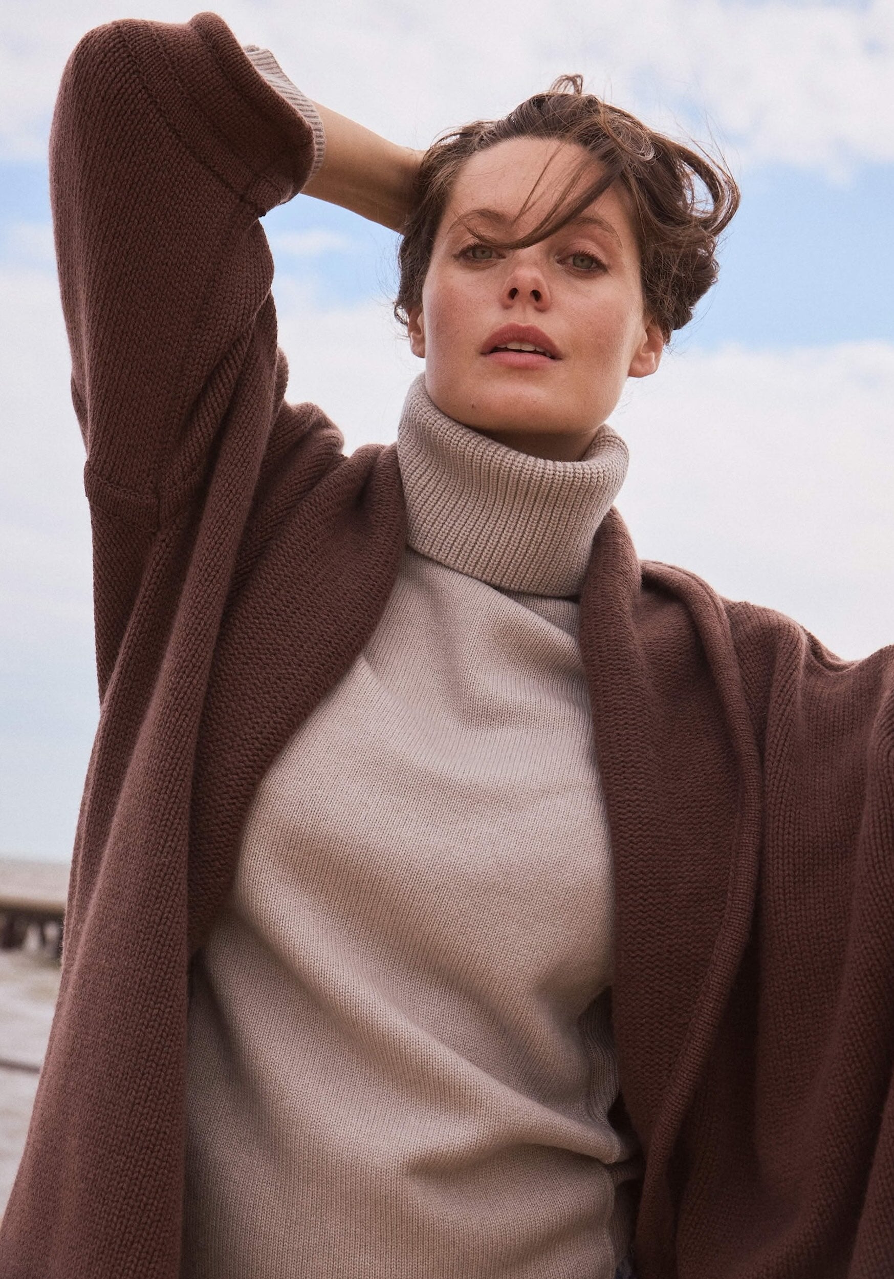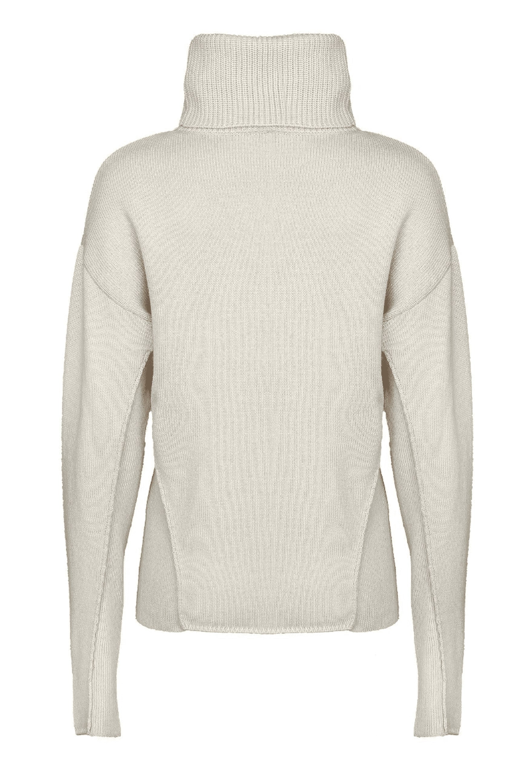 Design: Our champion jumper coming in black, soft grey, navy, chocolate, orange, oat, turquoise and butter. Made from premium sustainable cashmere blended with premium sustainable wool. High roll neck which can be doubled over, traditional Jean & Temple drop shoulder, oversized, snuggly fit. Intricate visible hemline detail on inner arms and inner body making it a uniquely fitting jumper outlining your silhouette.