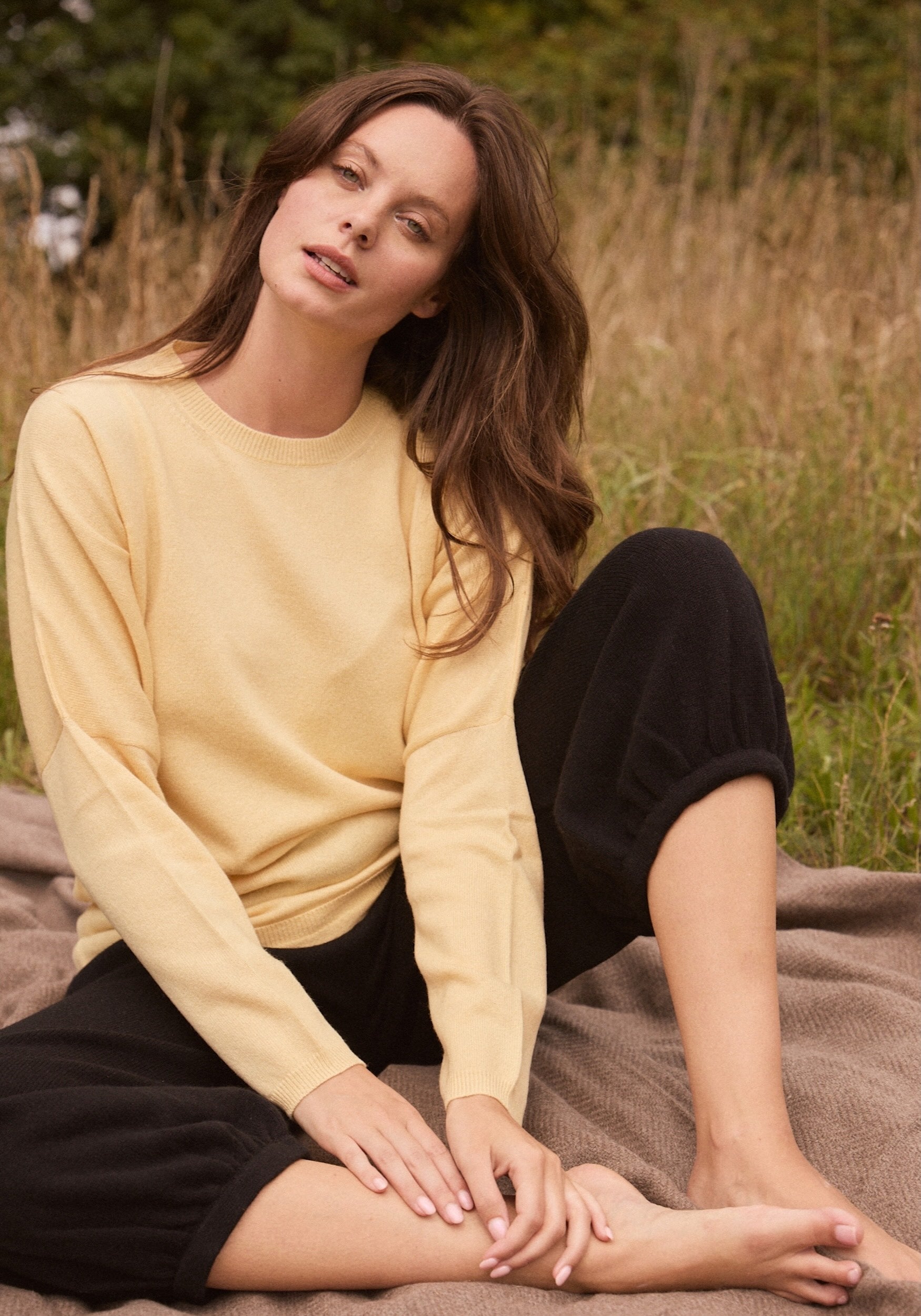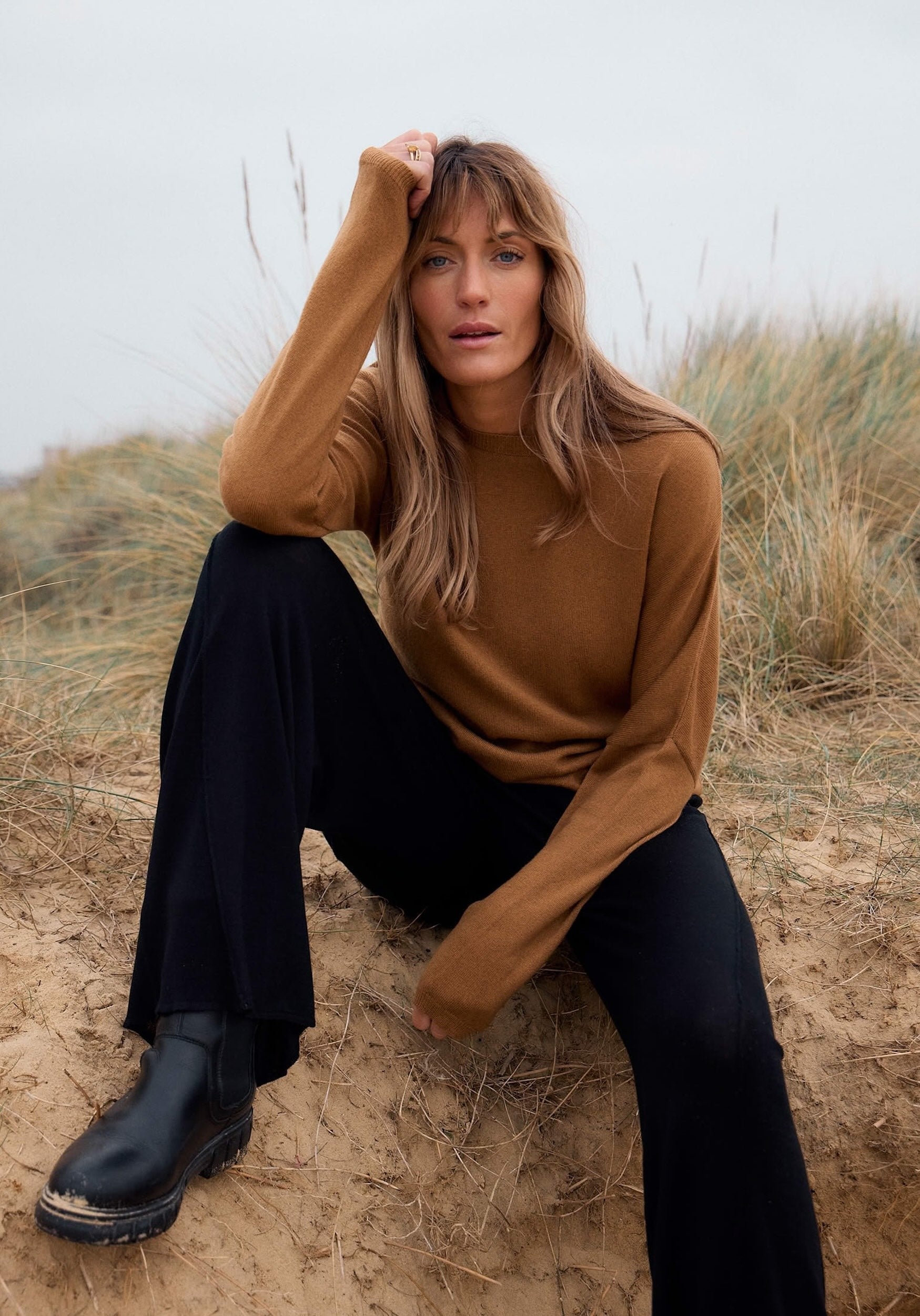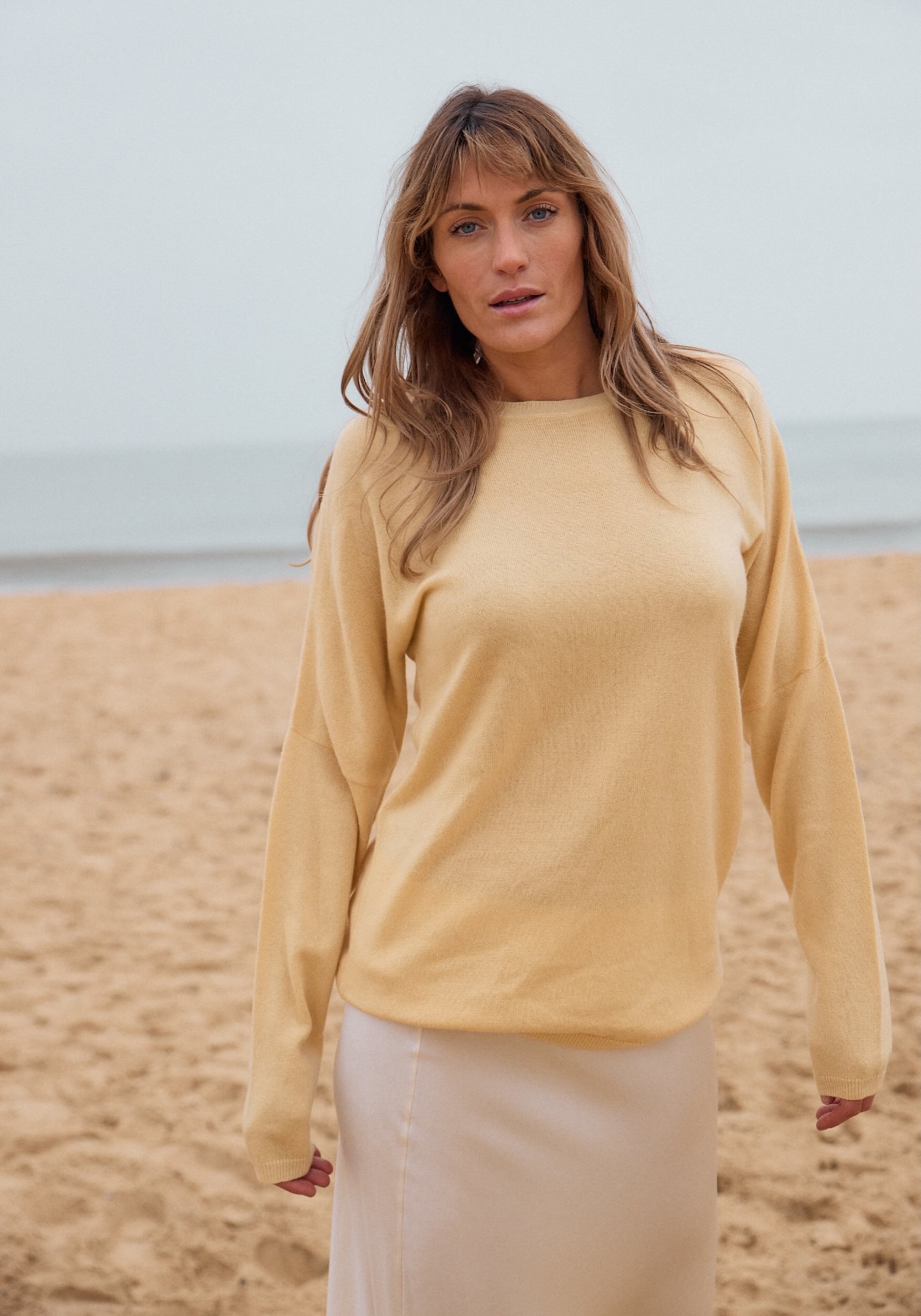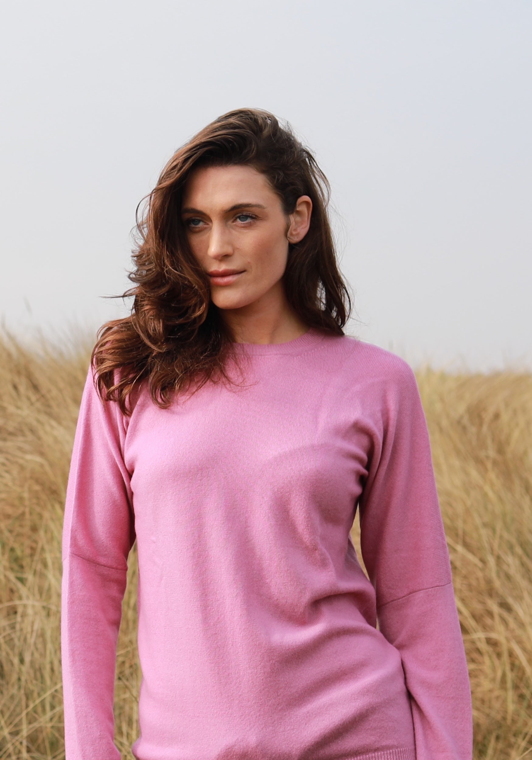 Design: Chocolate, concrete grey, petrol blue and raspberries & cream. A mix of premium cashmere and premium wool. These jumpers hang loosely on the figure with drop shoulders and long sleeves making this a super comfy and relaxed fit.