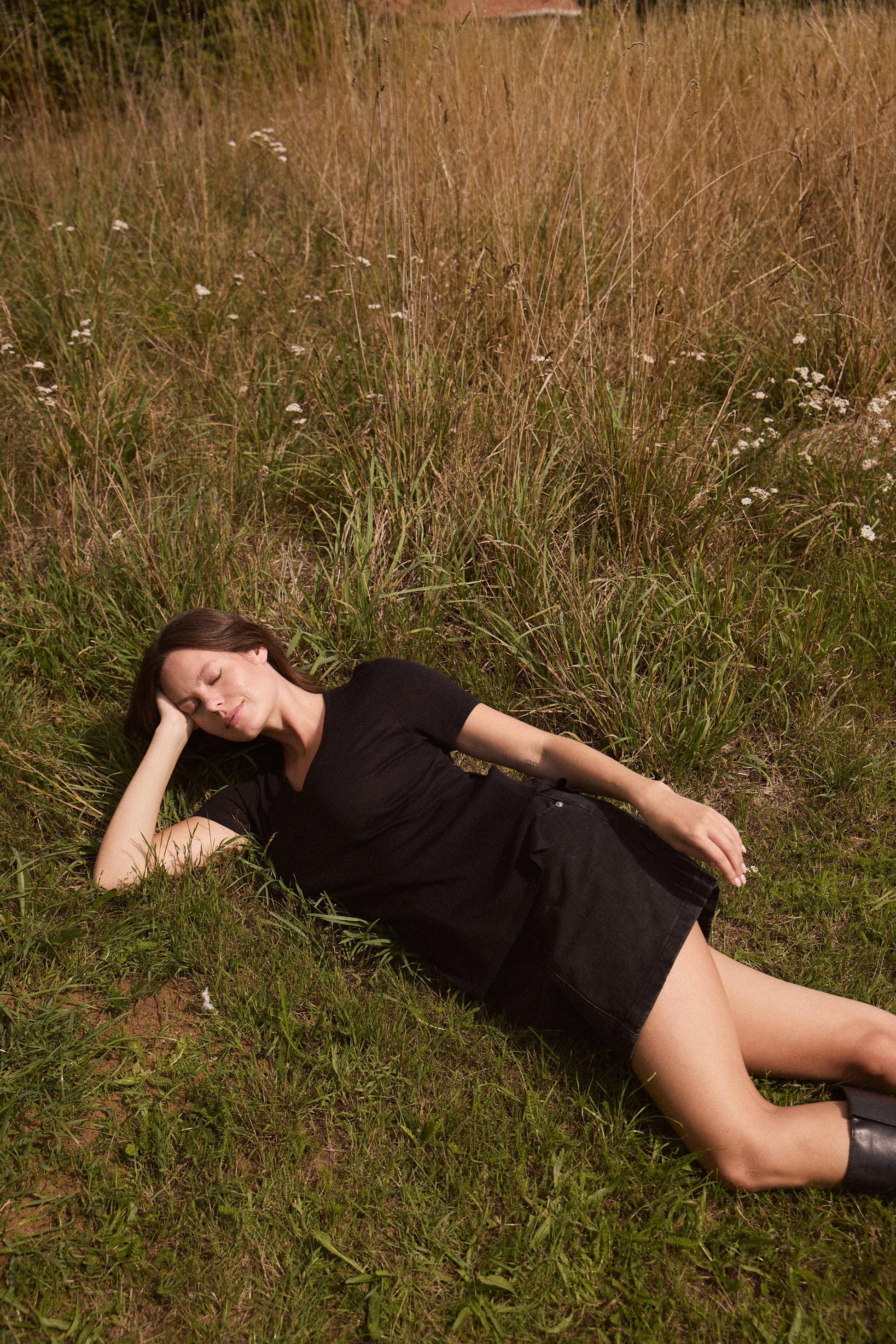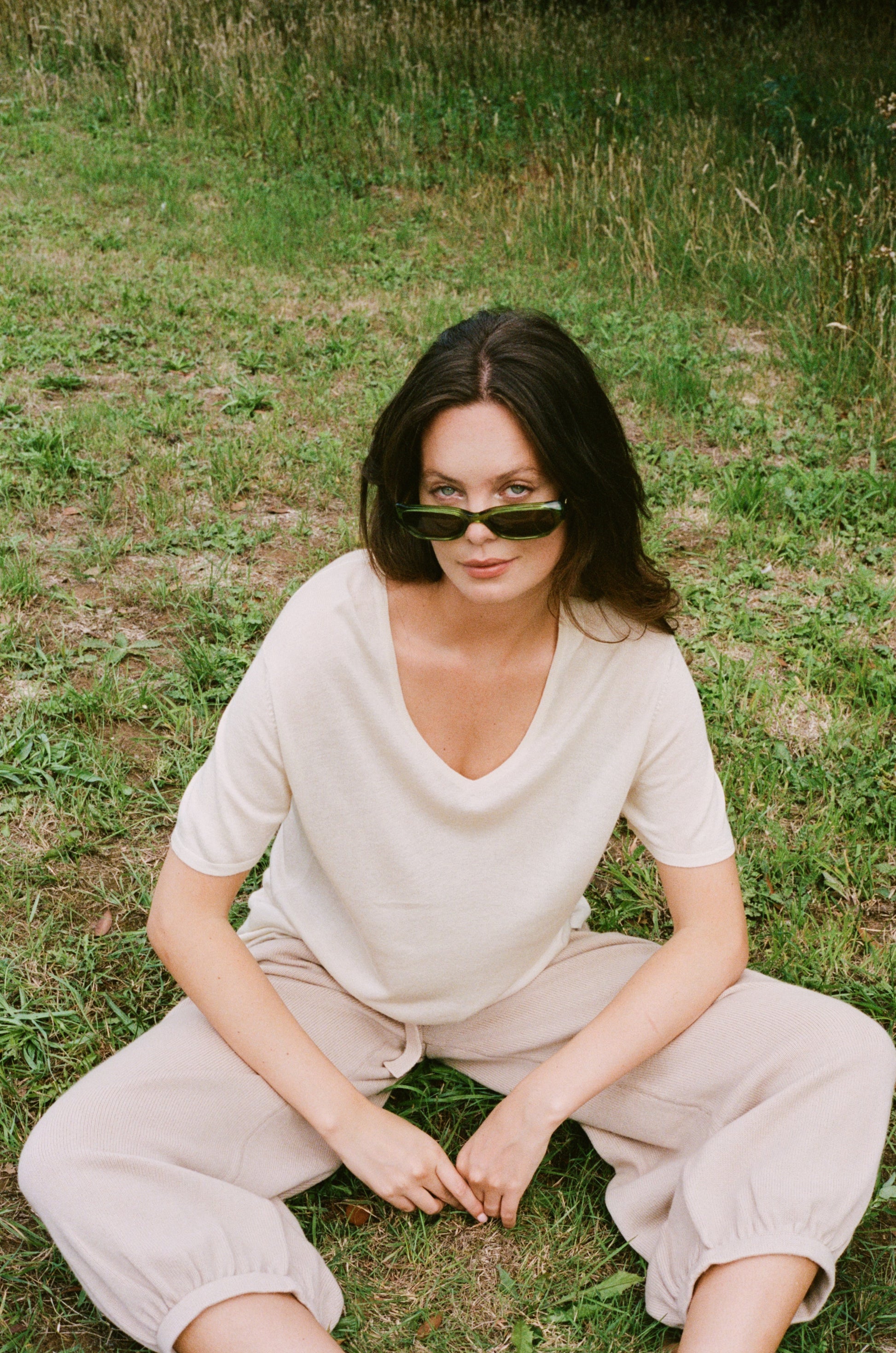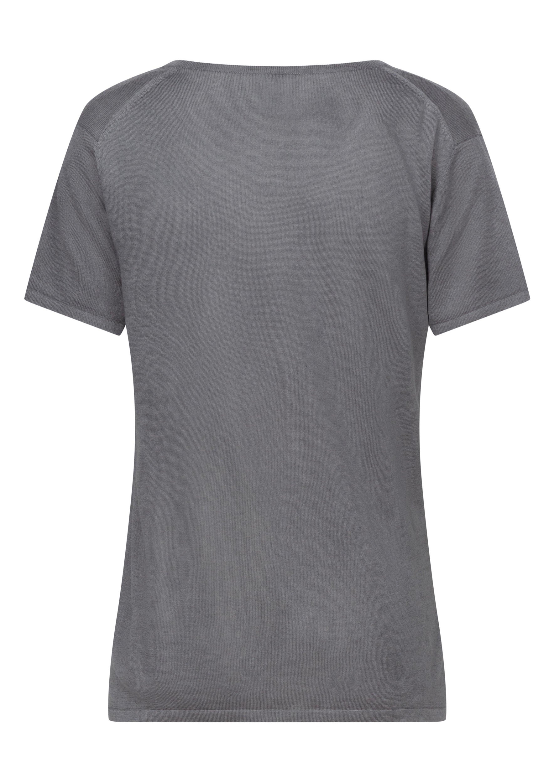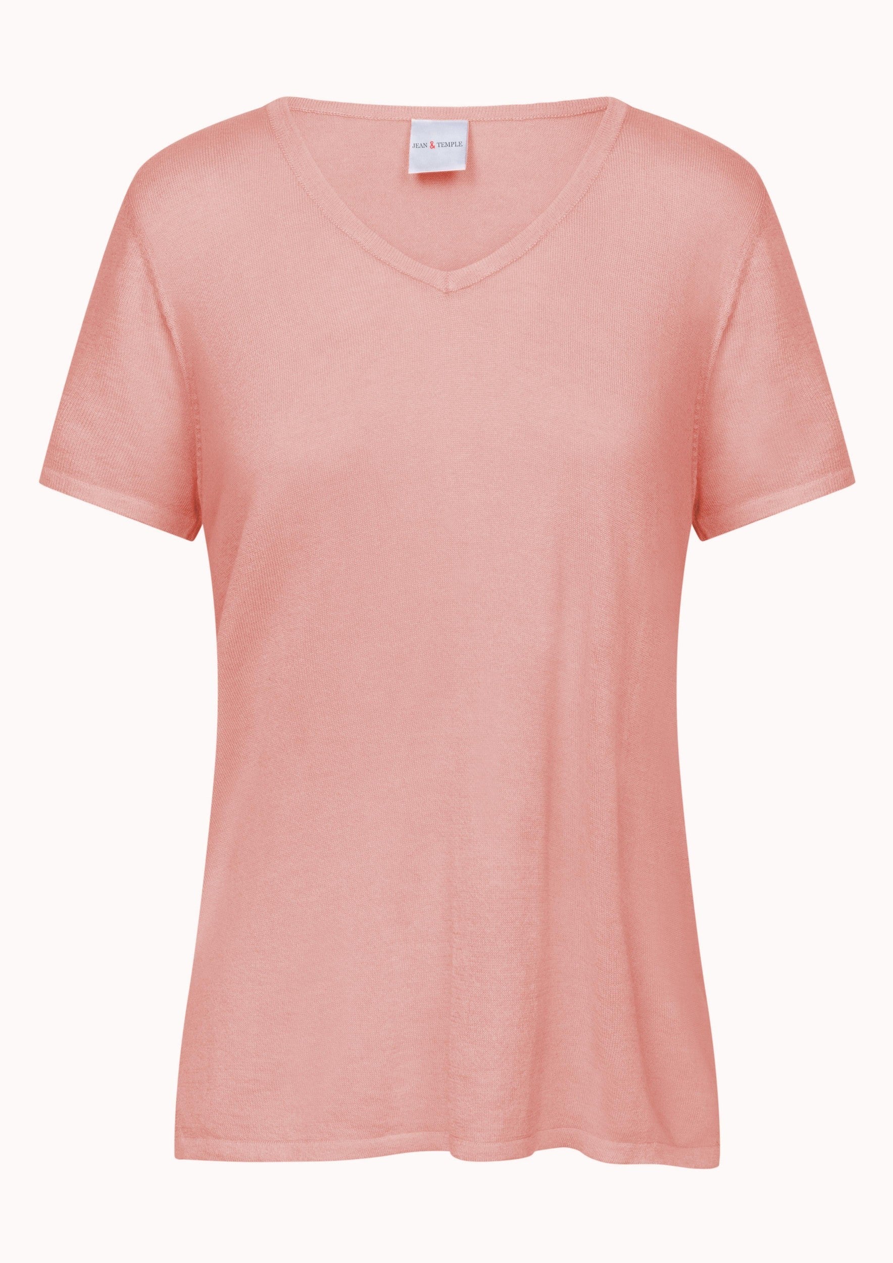 Design: Chocolate, Black, storm blue, candy floss pink, grey and cream. Elegant, super soft T's in a sustainable silk and cashmere blend, great for dressing up with leather pants or jeans. These T's hang loose on the figure and are just the right length on the hip so there is no rising up. They also have a small slit either side of the hip for movement.