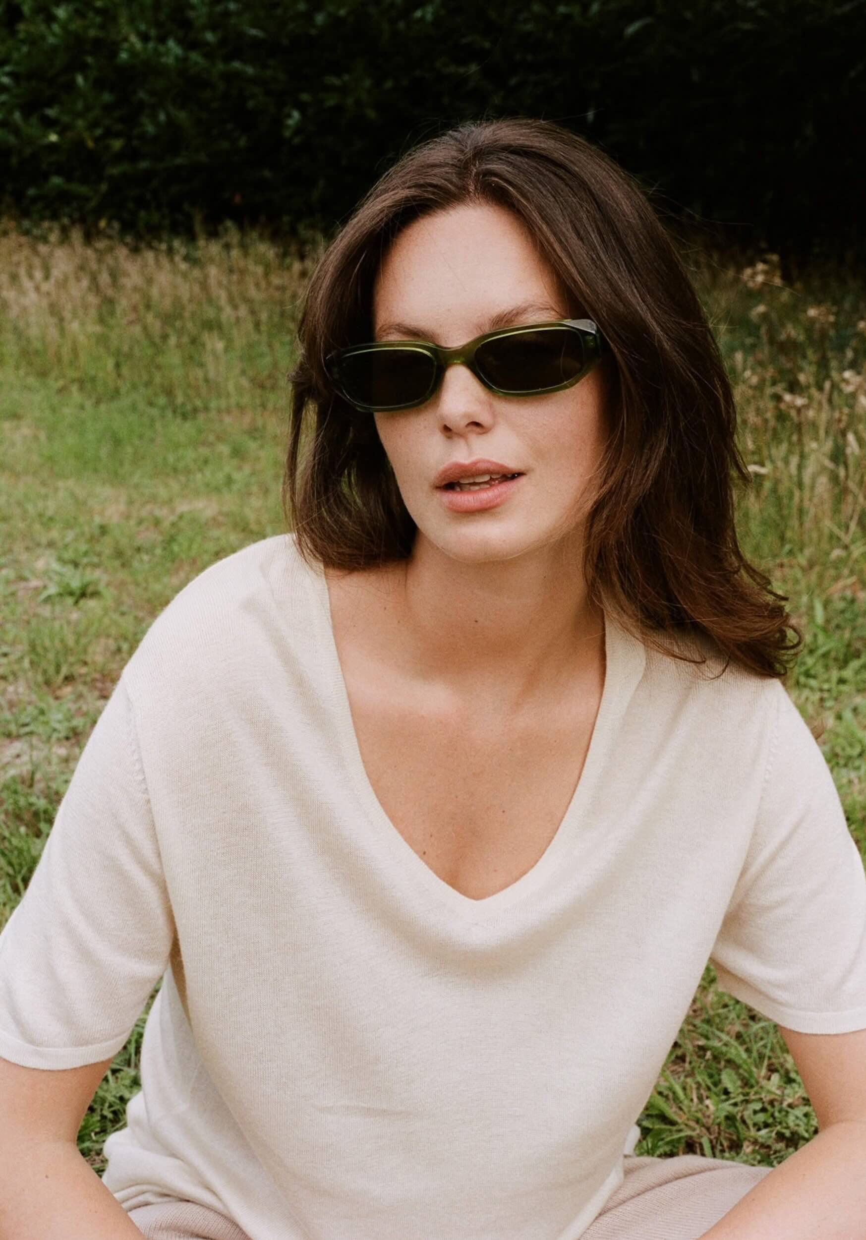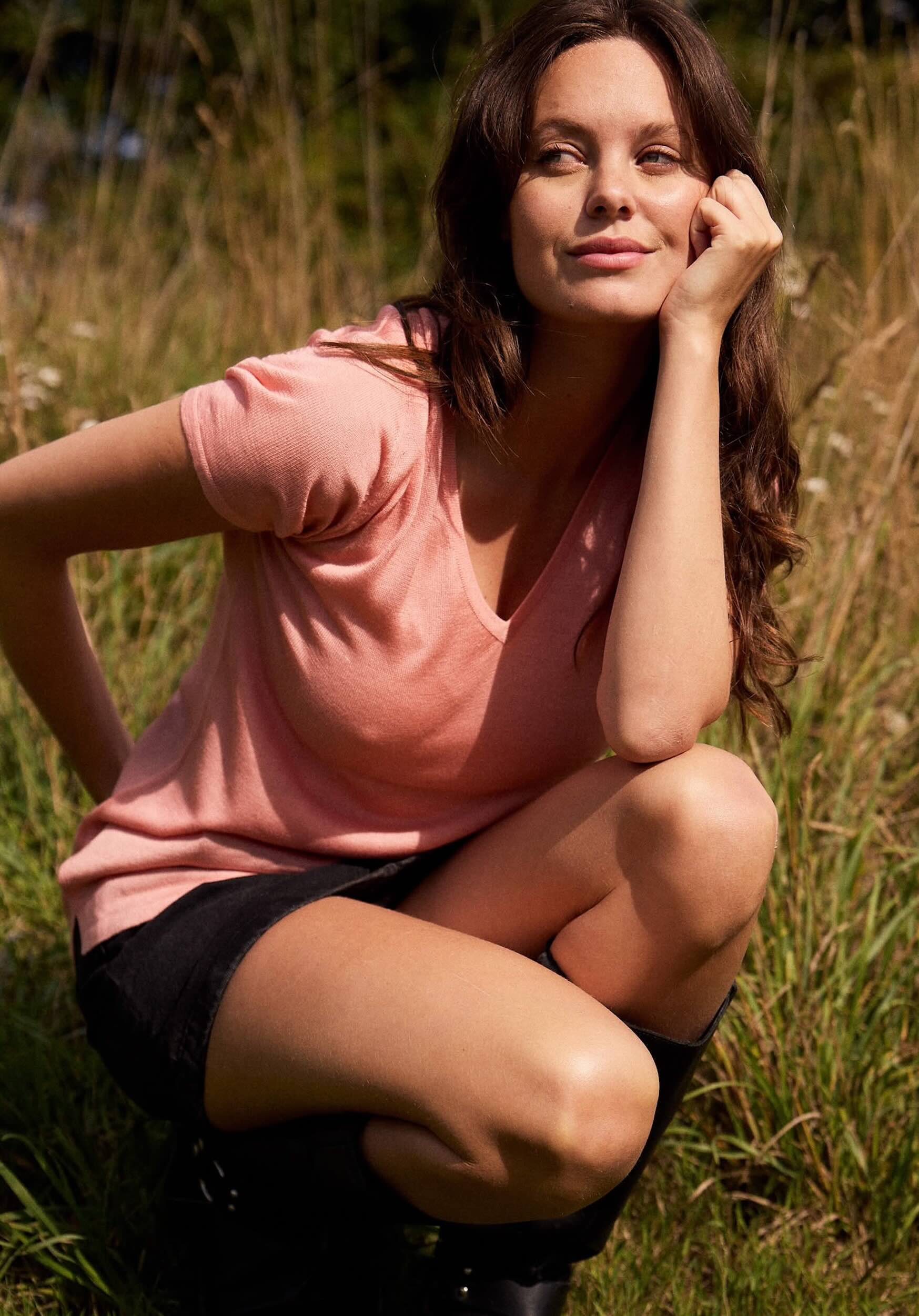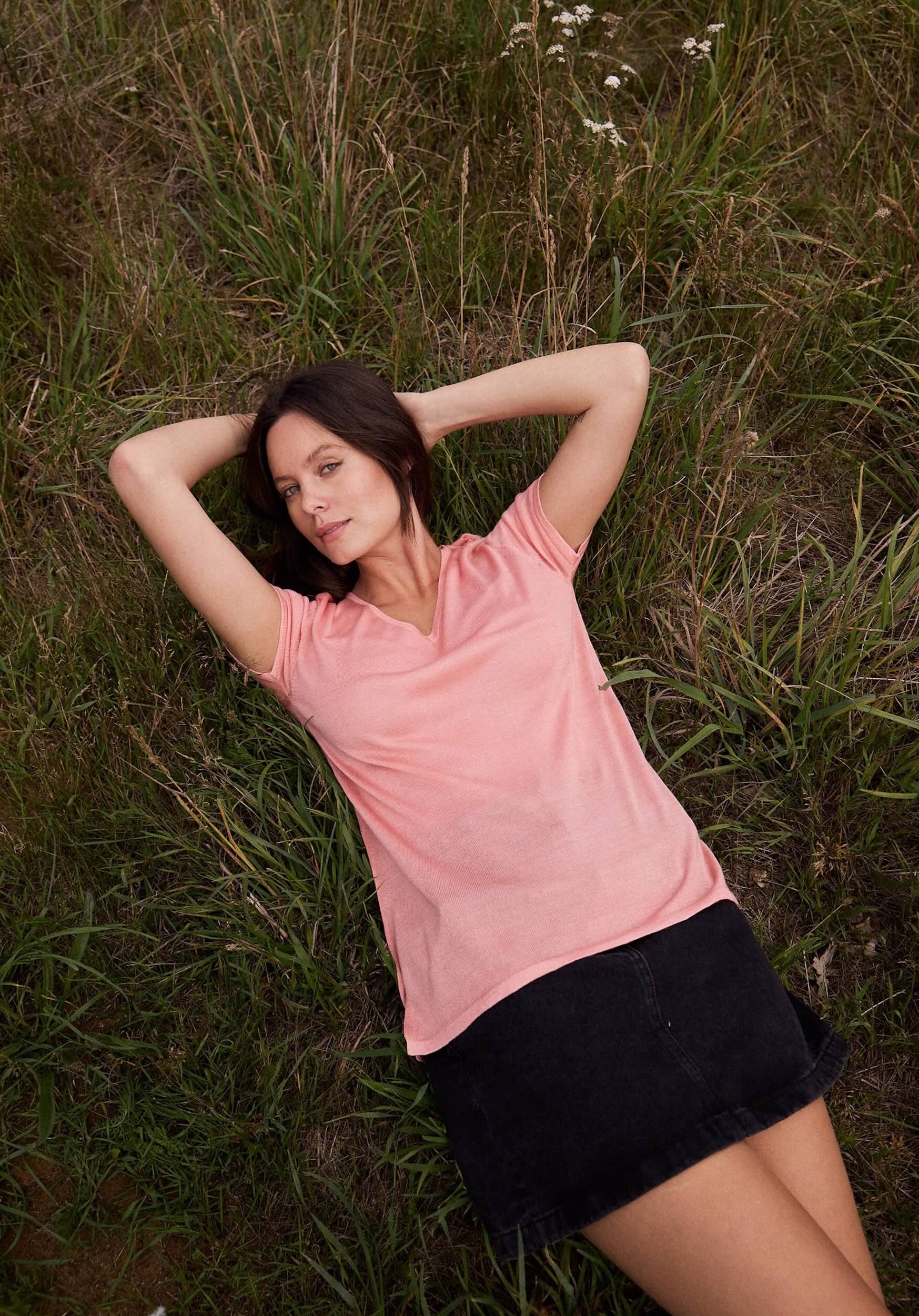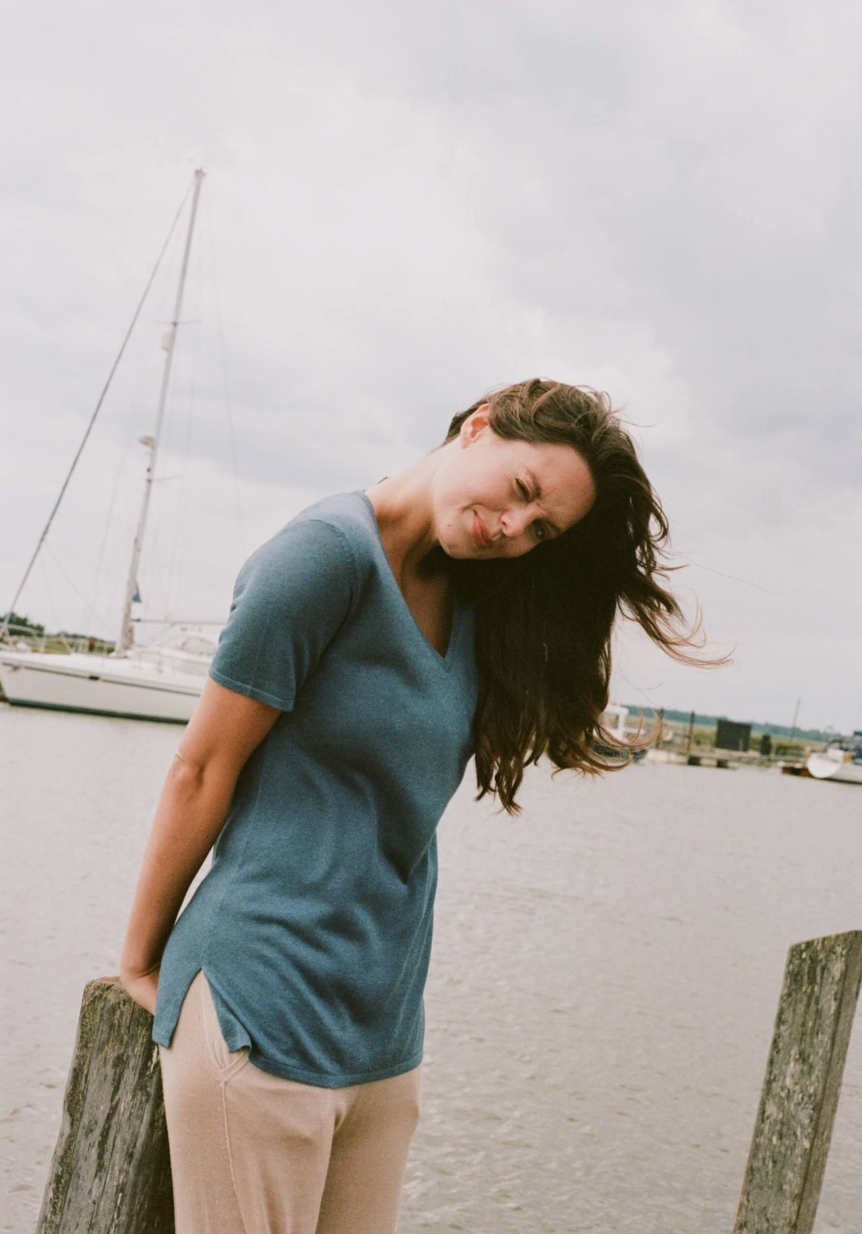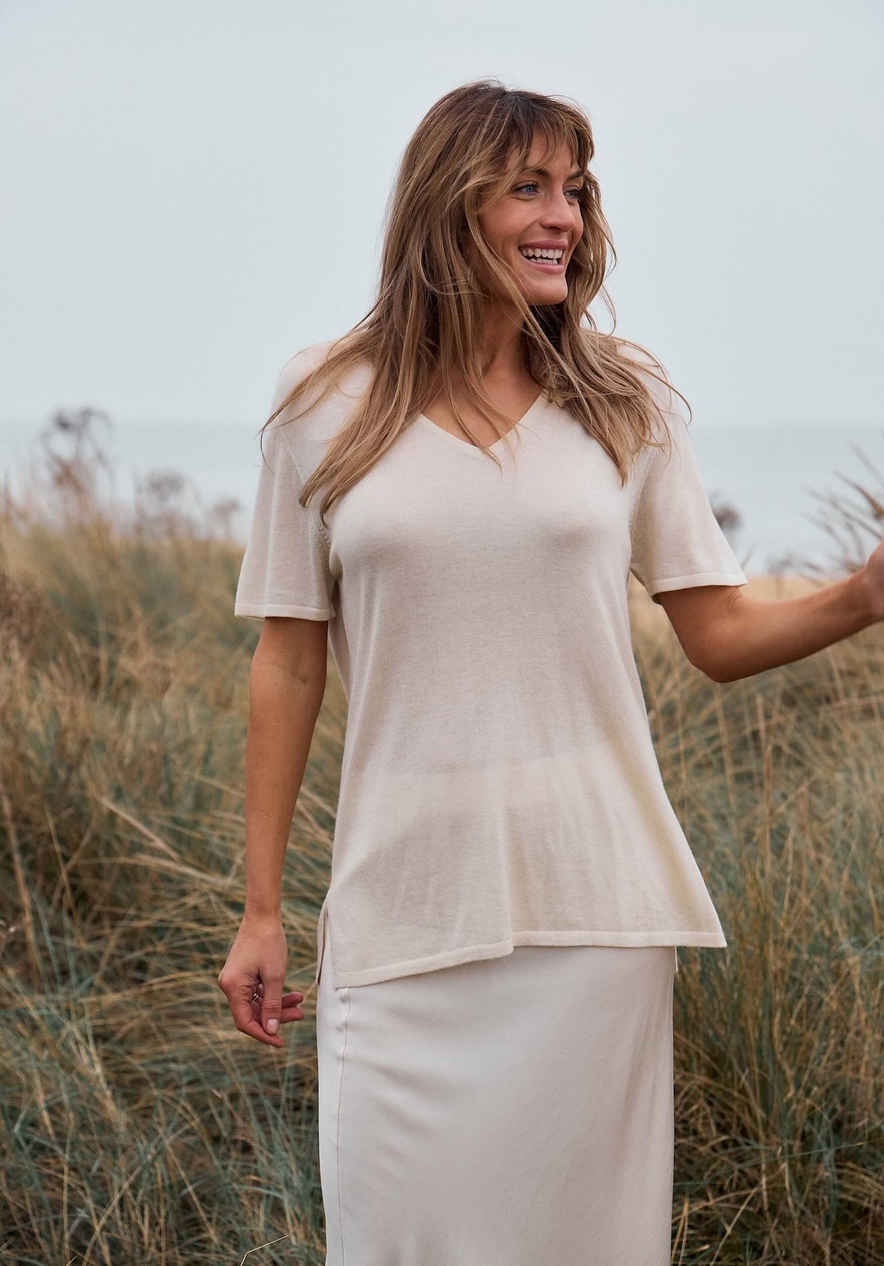 Design: Chocolate, Black, storm blue, candy floss pink, grey and cream. Elegant, super soft T's in a sustainable silk and cashmere blend, great for dressing up with leather pants or jeans. These T's hang loose on the figure and are just the right length on the hip so there is no rising up. They also have a small slit either side of the hip for movement.