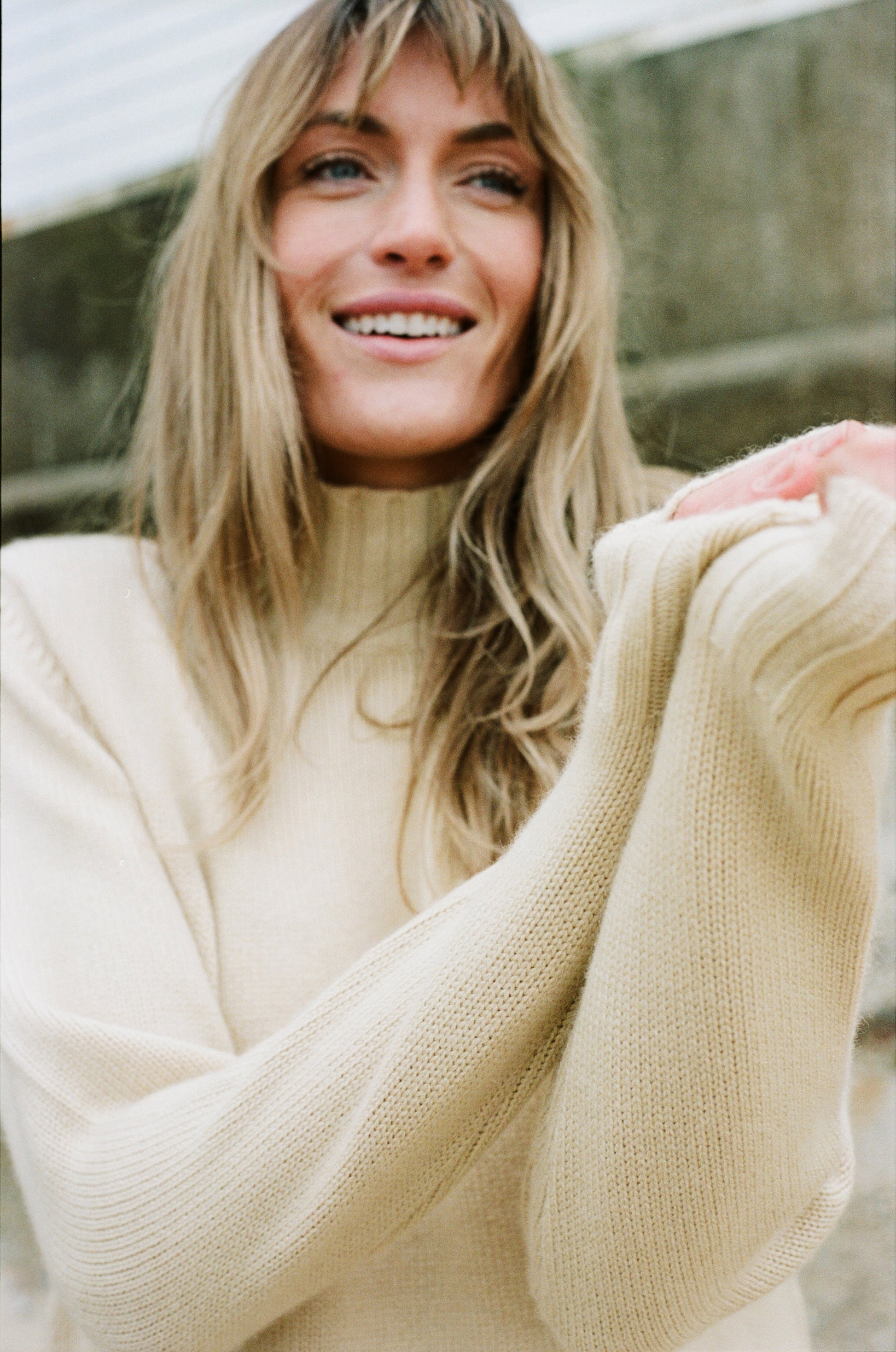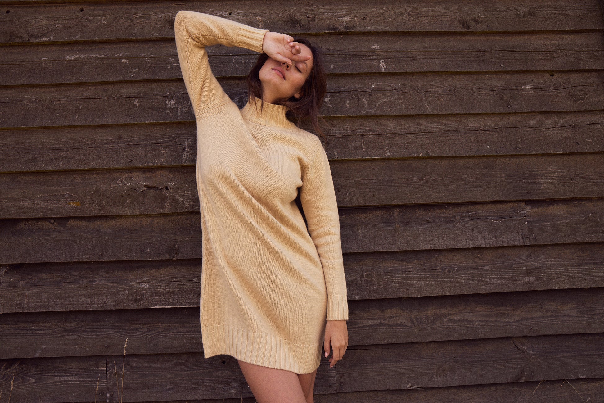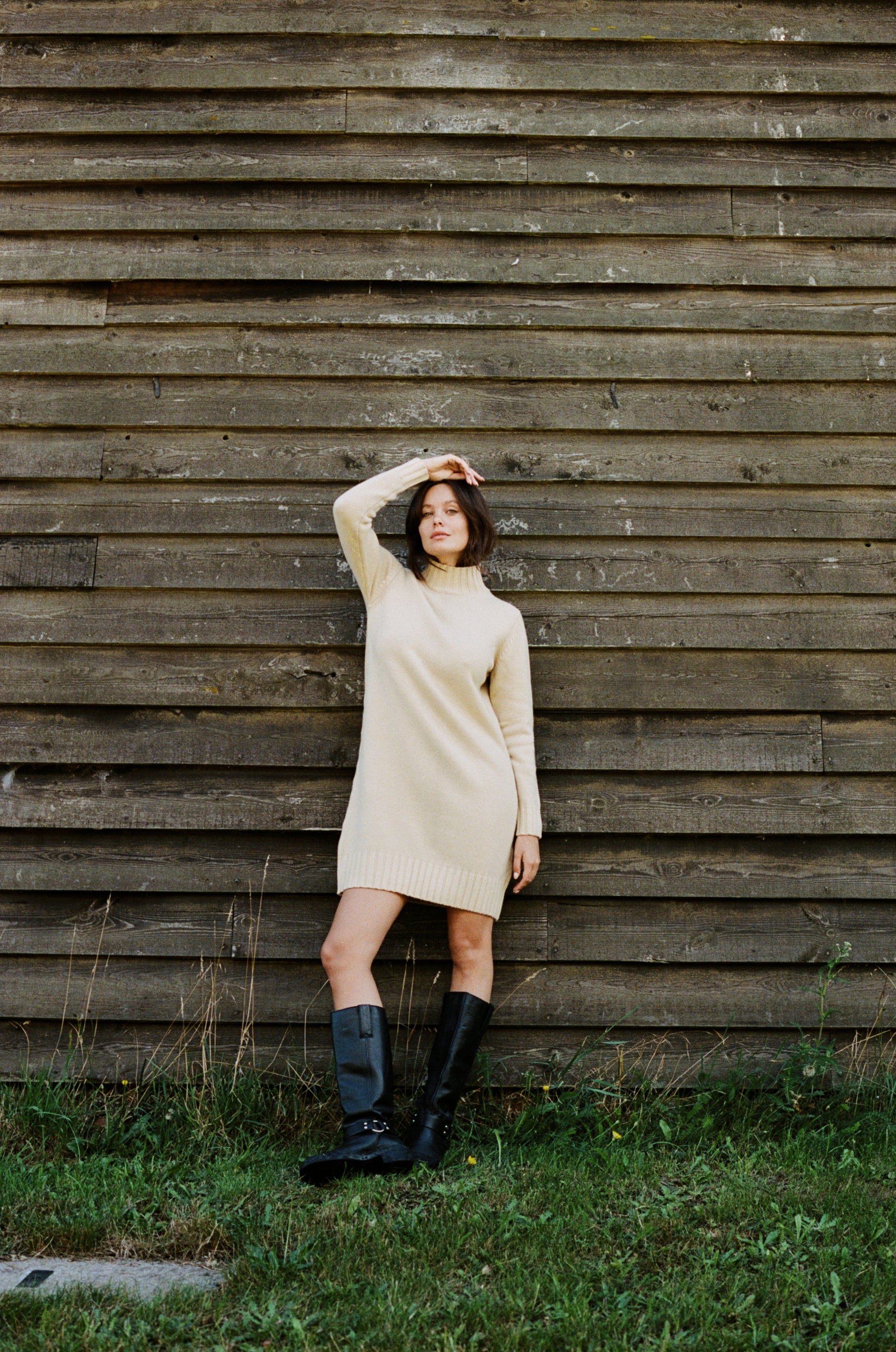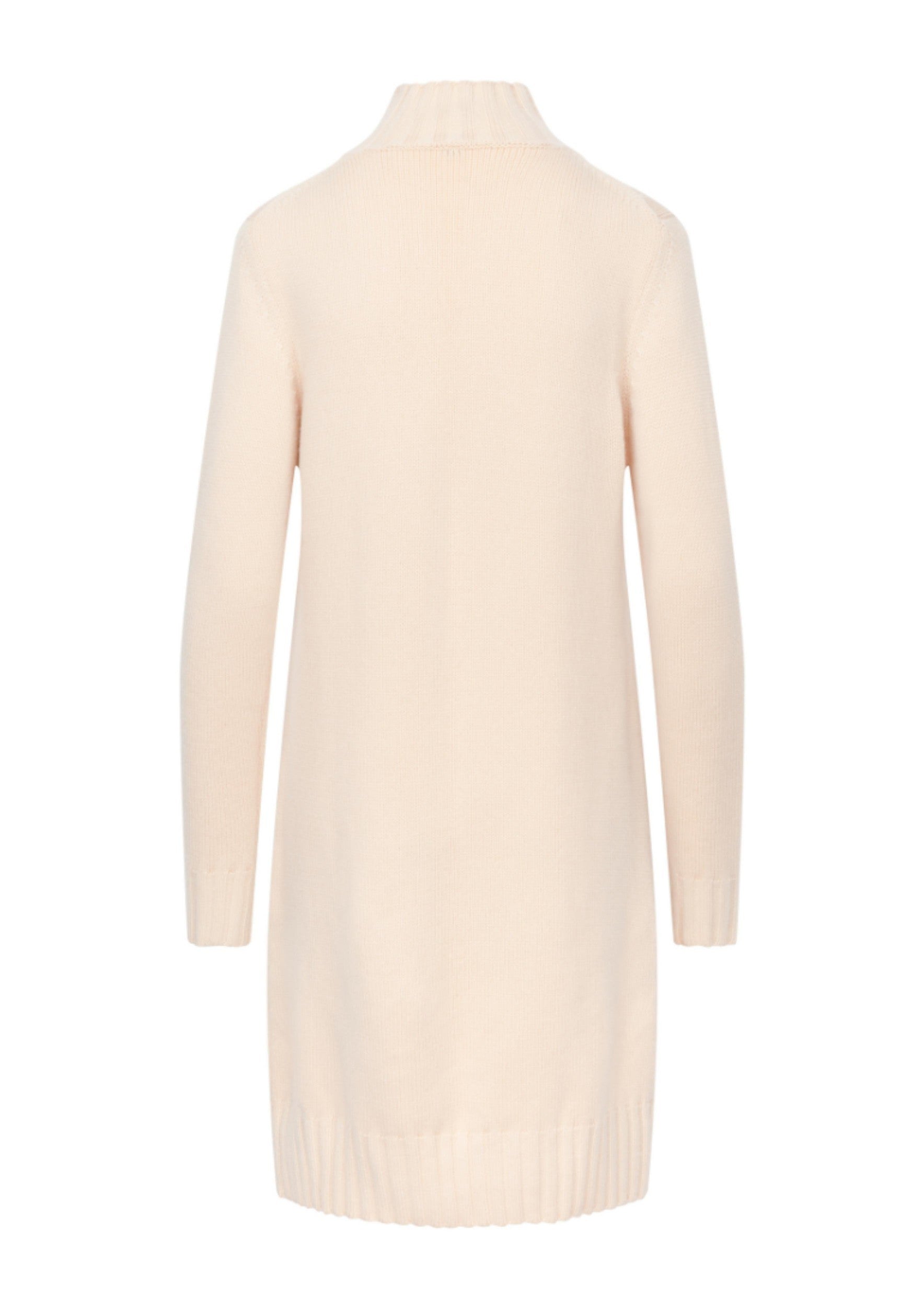 Design: Light oat. Ribbed funnel neck, long sleeves, just below knee length dress. Ribbing detail on bottom of dress and sleeves. Warm, winter dress great with tights and boots.