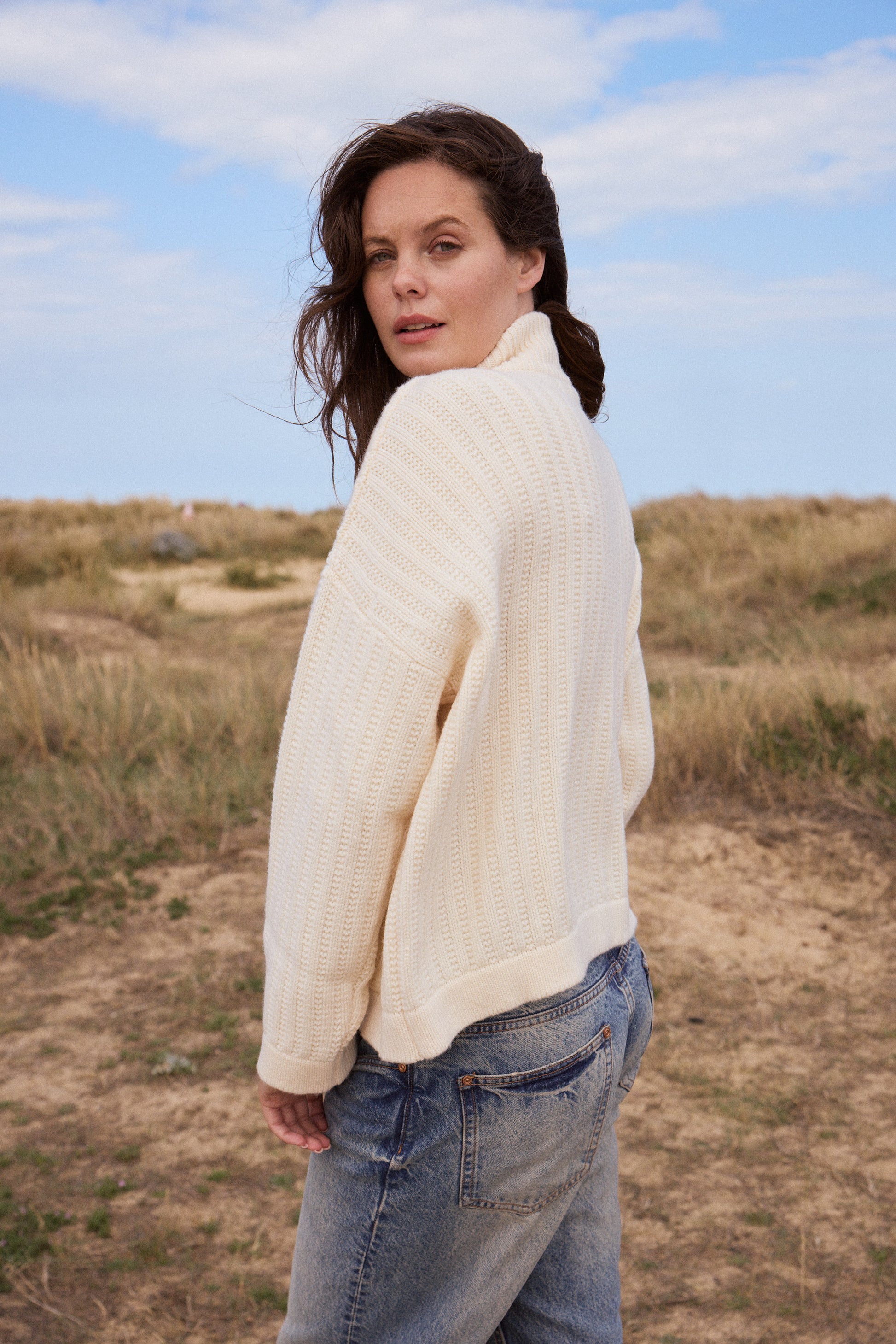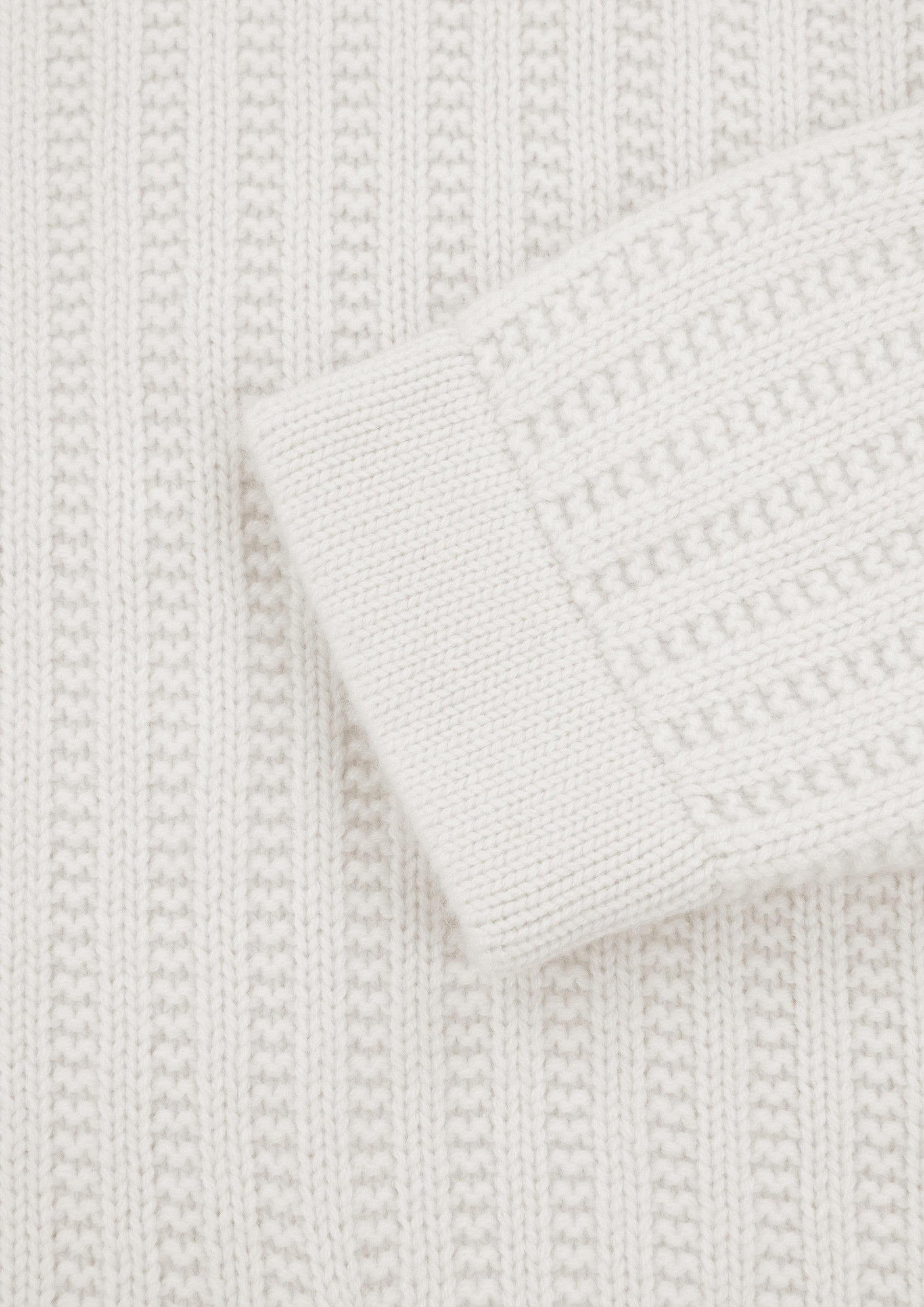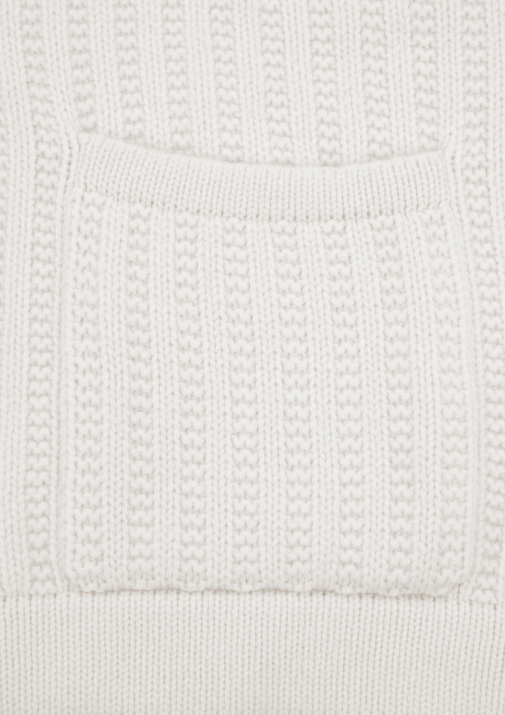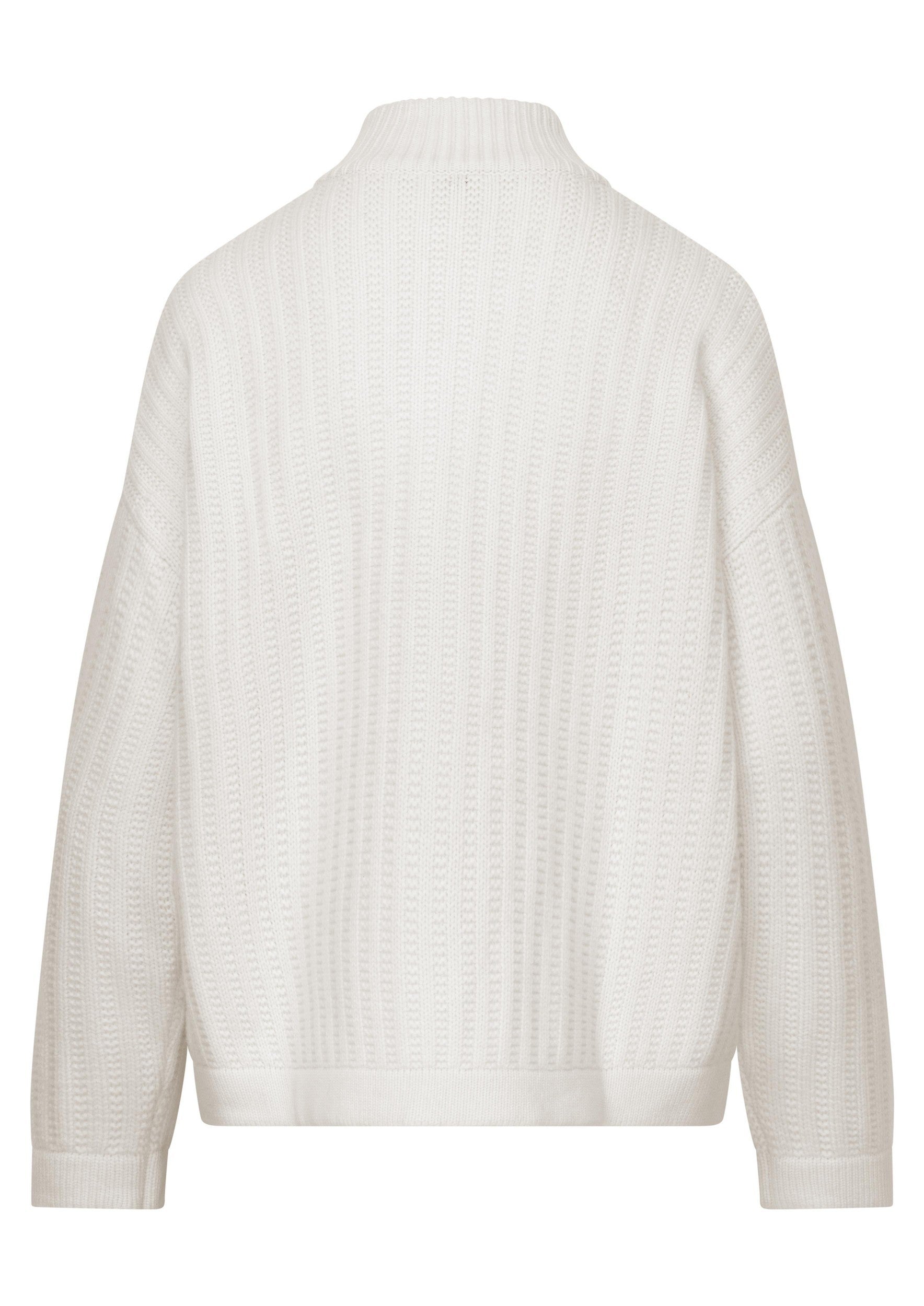 Design: White, zip up cardigan, in thick knit, with two pockets at front and funnel neck. Sportswear chic.